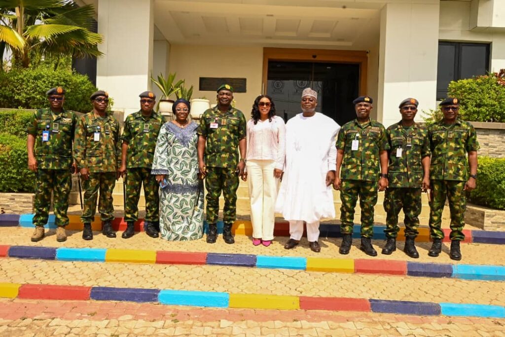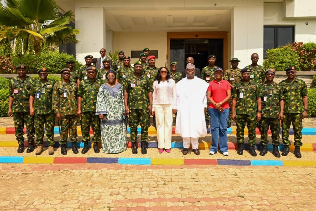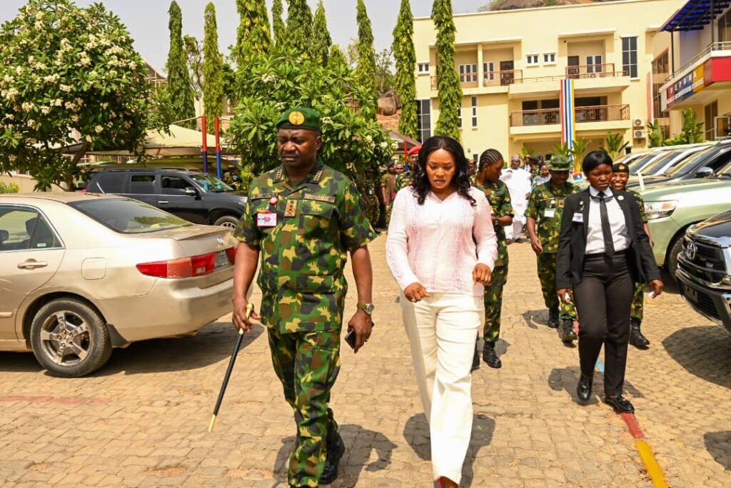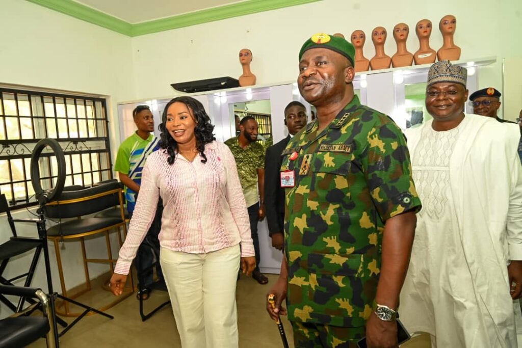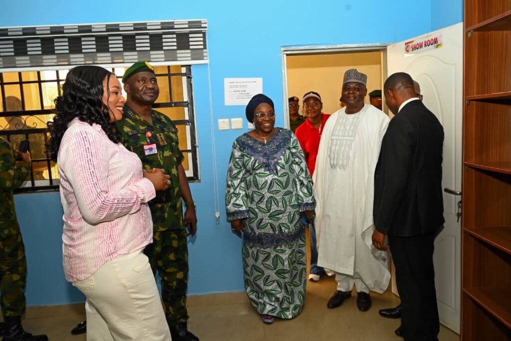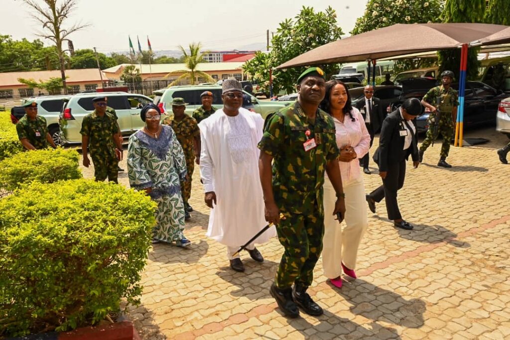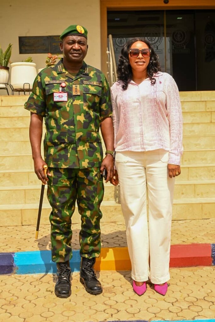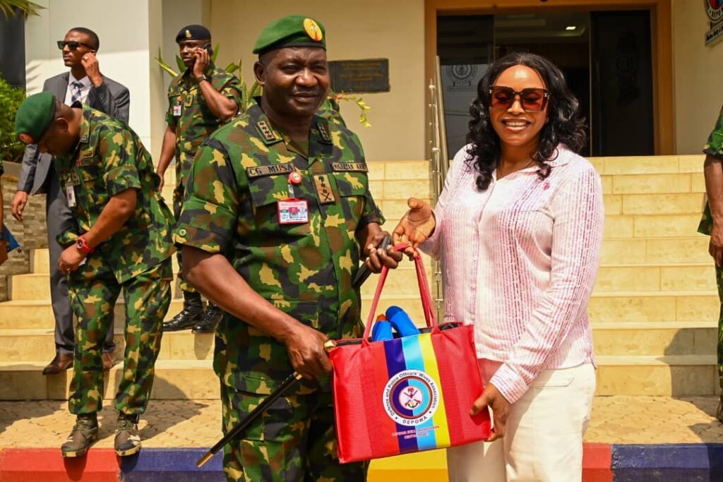 The Chief of Defence Staff(CDS) General Christopher Gwabin Musa paid a working visit to the DEPOWA Secretariat today 4 April 2024. He was received by the President DEPOWA Mrs Oghogho Musa and thereafter went on a tour of the DEPOWA Skill Acquisition Centre were trainees are taught on Catering Services, Fashion Designing,Hair Making/makeup and Gele Tying. Others are Production of house hold products, Information Communication Technology and Barbing. The CDS also inspected the DEPOWA Guest house that will soon be commissioned. In his remark, he appreciated the President DEPOWA for her leadership and urged all the staff of DEPOWA to remain committed to their duties.