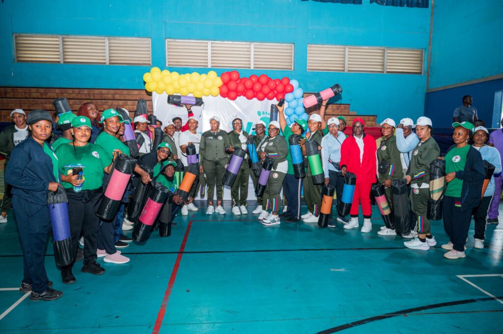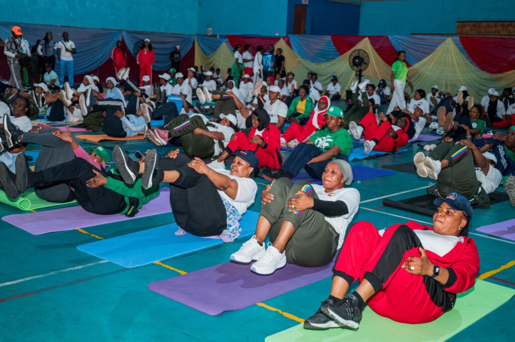 Highlight of the event included aerobic exercise, presentation of 100 gym mats to early attendees, and group photographs.