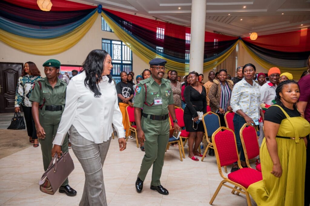 The President of the Defence and Police Officers’ Wives Association, Mrs Oghogho G.Musa was at the DEPOWA Nursery, Primary and Secondary School Hall, Mogadishu Cantonment, Asokoro on Thursday, 25th July, 2024; where starter packs were officially presented to beneficiaries of batch 14, 15 and 16 of 2023 trainees of DEPOWA Skills Acquisition Centre (DSAC).
